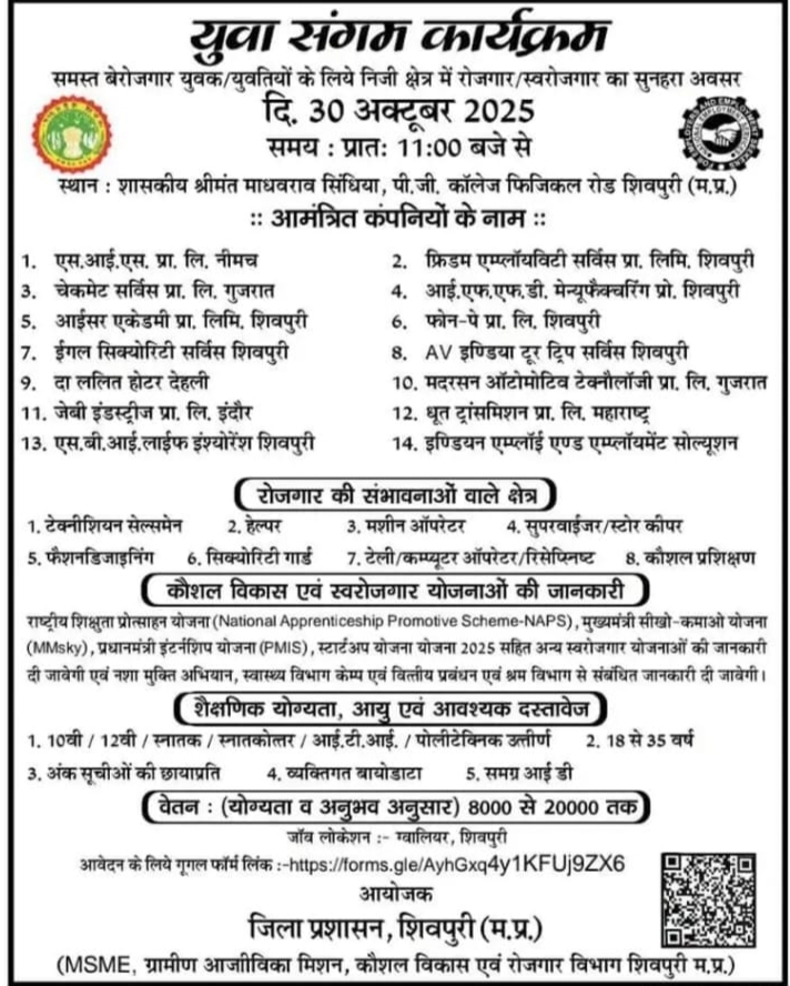 Jobs Fair Shivpuri 2025:- युवा संगम कार्यक्रम -Jobs Fair Shivpuri 2025 मे समस्त बेरोजगार युवक/युवतियों के लिये निजी क्षेत्र में रोजगार/स्वरोजगार का आया सुनहरा अवसर। जिला प्रशासन, शिवपुरी (म.प्र.)। यह (MSME, ग्रामीण आजीविका मिशन, कौशल विकास एवं रोजगार विभाग शिवपुरी म.प्र.) के द्वारा आयोजीत किया जा रहा हे। इसमे कुल 14 कॉम्पनियाँ लगभग आठ technical positions के लिए भर्ती कारेगे। ईसमें सभी राज्यों के Candidates कंपनी के Direct Hiring में भाग लेने के लिए जा सकते हैं।यह ITI Pass-out बचों तट Freshers के लिए एक बहत अच्छा opportunity साबित होगी। यदि आप भी एक अच्छी नौकरी प्राप्त करना चाहते हैं इस बेहतरीन नौकरी का अवसर हाथ से जाने न दें ।विस्तुत जानकारी नीचे Article में दिया गया हैं।