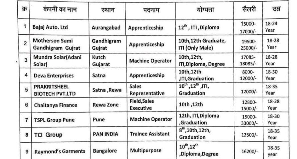 MP Rojgar Mela 2026 :- ओएस/आई०टी०आई०/टीपीओ/रोजमेला/ 2026/के द्वारा संस्था में दिनांक 15 जनवरी 2026 दिन गुरुवार को प्रातः 11.00 बजे से (PMNAM) एवं युवा संगम (Rojgar Mela) का आयोजन जिला प्रशासन, जिला रोजगार कार्यालय मैहर, जिला उद्योग केंद्र एवं शासकीय आईटीआई मैहर के सहयोग से Government ITI Mehar, जिला मैहर में किया जा रहा है। जिसमें देश, प्रदेश एवं जिला स्तरीय प्रतिष्ठित कंपनियां औद्योगिक इकाइयां, संगठनों/संस्थानों के प्रमुख/प्रतिनिधि जिले एवं प्रदेश के युवाओं को रोजगार के सुअवसर प्रदान करने के लिये सम्मिलित हो रहे हैं। अतः क्षेत्र के रोजगार मेला में 10वीं, 12वीं आईटीआई, डिप्लोमा एवं स्नातक उत्तीर्ण छात्र एवं अंतिम वर्ष में अध्ययनरत छात्र रोजगार मेला में सम्मिलित होकर रोजगार के सुअवसर प्राप्त कर सकते हैं। रोजगार मेला में सम्मिलित होने वाली कंपनियों की योग्यता एवं सैलरी से संबंधित विवरण निम्नानुसार है।