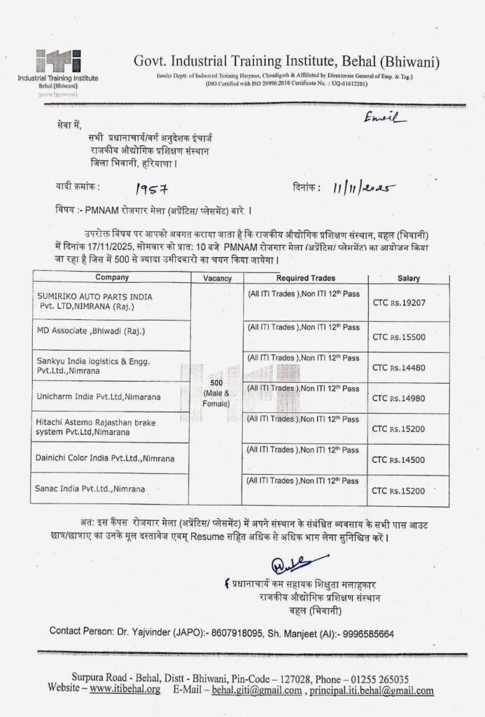PMNAR Rozgar Mela ITI 2025:- The Govt. Industrial Training Institute in Behal (Bhiwani) has put out an important announcement. The PMNAM Rozgar Mela (Apprentice/Placement) is set to take place on Monday, November 17, 2025, starting at 10:00 AM. This job fair aims to select over 500 candidates, welcoming both male and female applicants.